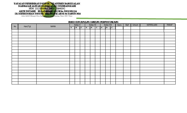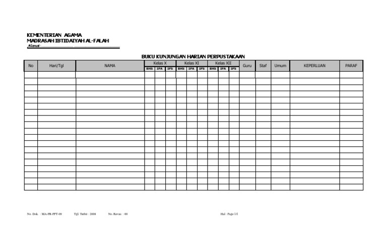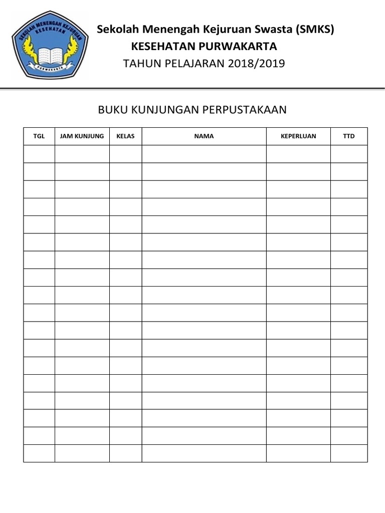 Di isi jumlah buku keseluruhan selama satu tahun berdasarkan no kalsifikasi/ ddc iv. Download contoh buku kunjungan,yang mungkin anda butuhkan saat ini,maka tepat sekali mengunjungi blog kami karena dalam kali ini kami akan memudahkan anda semua dalam mencari tentang contoh daftar pengunjung perpustakaan sekolah dan contoh format daftar hadir pengunjung perpustakaan,kami pastikan juga anda bisa mendapatkan file buku kunjungan kelas perpustakaan lengkap untuk bahan administrasi. Selain smp dan mts, format buku kunjungan perpustakaan ini dapat juga diterapkan untuk perpustakaan sekolah tingkat lainnya seperti sd/ mi, sma/ ma/ smk karena. Di dalam buku kunjungan harian dicantumkan nama pengunjung dan keperluan di perpustakaan sekolah. Kegiatan gls ini menjadikan siswa lebih giat untuk berkunjung ke perpustakaan untuk meminjam buku yang disukainya.